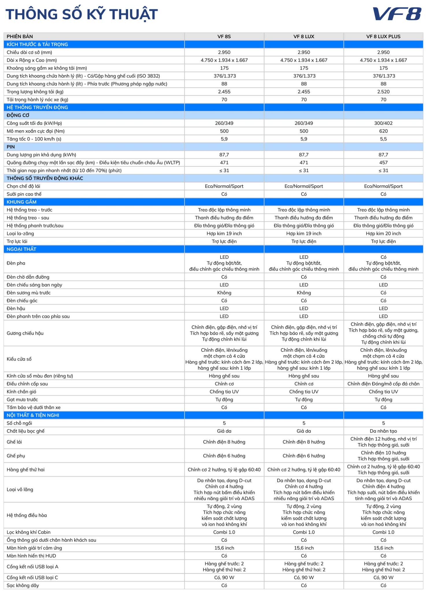 VinFast VF 8 Lux với thiết kế mới sang trọng và công nghệ vượt trội. Với nhiều điểm nổi bật: ngoại thất hai tông màu, công nghệ trợ lý ảo Vivi 2.0 mới, ADAS và VF Connect. VinFast VF 8 Lux có hai tùy chọn là phiên bản thường và phiên bản Plus, trong đó phiên bản VF 8 Lux được trang bị động cơ điện có công suất 350 mã lực, đi được quãng đường 471km/lần sạc đầy, trong khi phiên bản VF 8 Lux Plus có sức mạnh lên tới 402 mã lực, đi được quãng đường 457km/lần sạc đầy.
